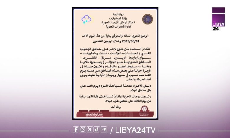 أصدر المركز الوطني للأرصاد الجوية تقريره حول الحالة الجوية المتوقعة اعتباراً من اليوم الأحد 1 يونيو 2025 ولمدة يومين قادمين، حيث يشير إلى نشاط جوي متزايد في مناطق الجنوب الغربي من البلاد.