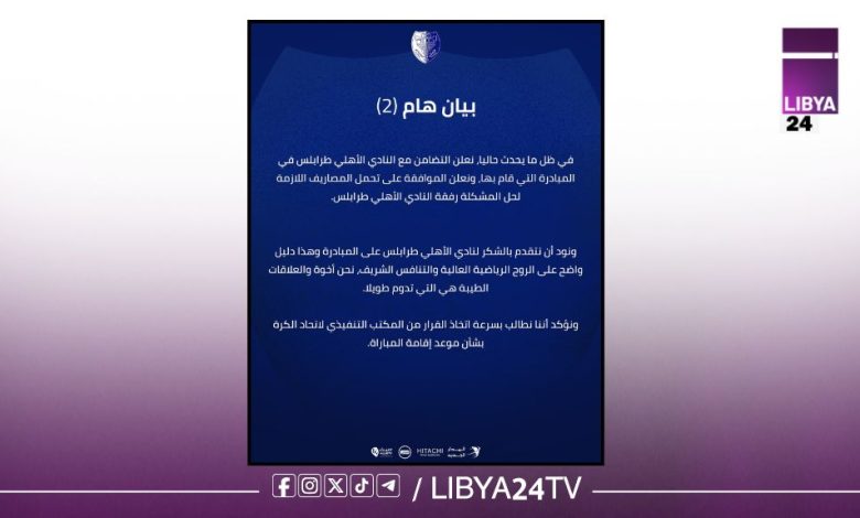 نادي الهلال يعلن تضامنه مع الأهلي طرابلس لحل المشكلة ودعم التنافس الشريف
