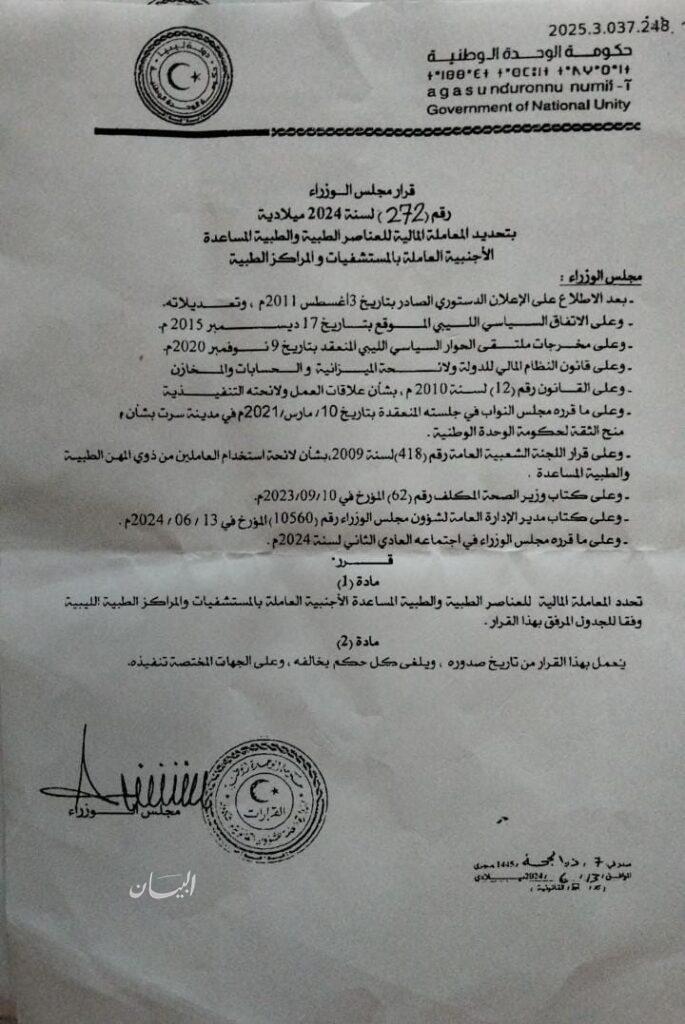 ورغم صدور القرار رقم 272 لسنة 2025، والذي يقضي بصرف رواتبهم المتأخرة إلا أن وزارة المالية في حكومة الدبيبة مناهية الولاية تجاهلت التنفيذ، تاركة هؤلاء الأطباء وعائلاتهم في مواجهة الفقر والاستدانة والضغط النفسي.