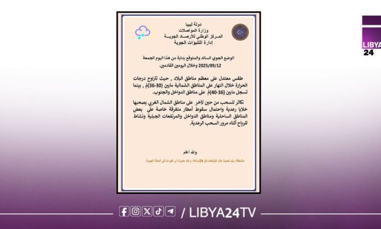 توقع المركز الوطني للأرصاد الجوية أن تشهد معظم المناطق طقسا معتدلا اعتباراً من اليوم الجمعة 12 سبتمبر 2025 وخلال اليومين القادمين، حيث تتراوح درجات الحرارة بين 30 و36 مئوية على المناطق الشمالية، وبين 36 و40 مئوية على مناطق الدواخل والجنوب.