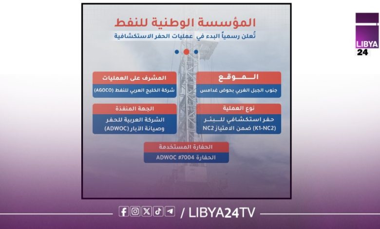 أعلنت المؤسسة الوطنية للنفط رسميًا عن بدء عمليات الحفر الاستكشافية في البئر (K1-NC2)، الواقع بمنطقة جنوب الجبل الغربي ضمن حوض غدامس، وذلك بإشراف مباشر من شركة الخليج العربي للنفط، إحدى الشركات التابعة للمؤسسة.