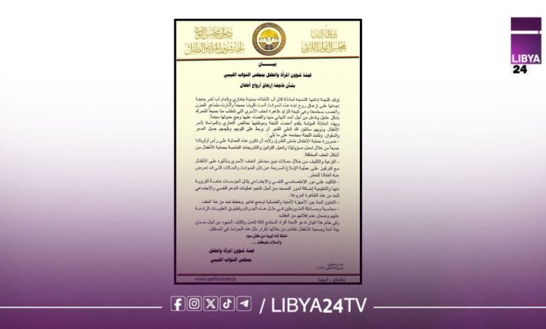 أصدرت لجنة شؤون المرأة والطفل بمجلس النواب الليبي بيانًا شديد الإدانة بشأن حادثتي قتل الأطفال اللتين شهدتهما مدينتا بنغازي وإجدابيا مؤخرًا، معتبرة أن هذه الجرائم “أدمت قلوب المجتمع وأثارت مشاعر الحزن والغضب”، مشددة على ضرورة التصدي لظاهرة العنف الأسري المتزايدة.