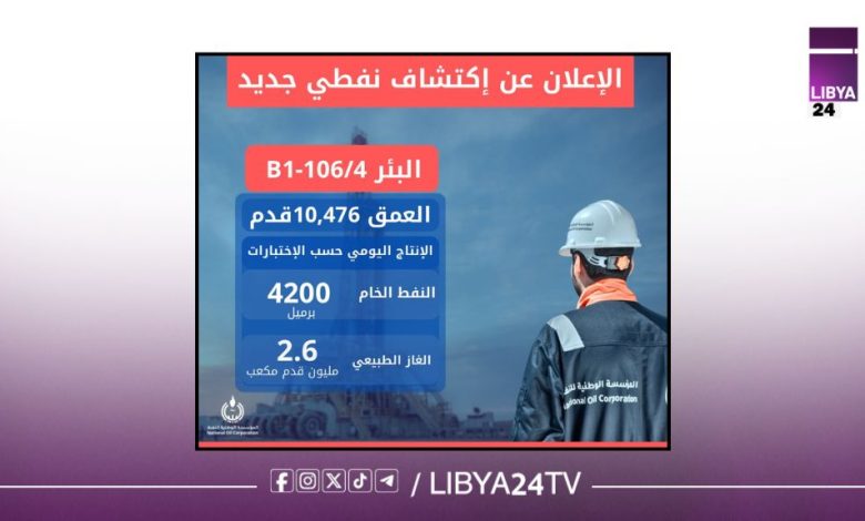 أعلنت المؤسسة الوطنية للنفط عن اكتشاف نفطي جديد حققته شركة (OMV النمساوية المحدودة – فرع ليبيا) في منطقة العقد 106/4 بحوض سرت، وذلك من خلال البئر الاستكشافي B1.