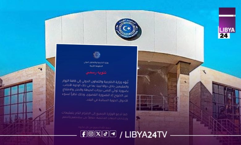أصدرت وزارة الخارجية والتعاون الدولي بالحكومة الليبية تنويهًا مهمًا موجّهًا إلى كافة الزوار والمقيمين داخل دولة ليبيا، بما في ذلك الإخوة الأجانب، دعت فيه إلى توخّي أقصى درجات الحيطة والحذر في ظل سوء الأحوال الجوية السائدة التي تشهدها البلاد خلال هذه الفترة. ويأتي هذا التنويه في إطار الحرص على سلامة الأرواح والممتلكات، وتفادي المخاطر المحتملة الناتجة عن التقلبات الجوية.