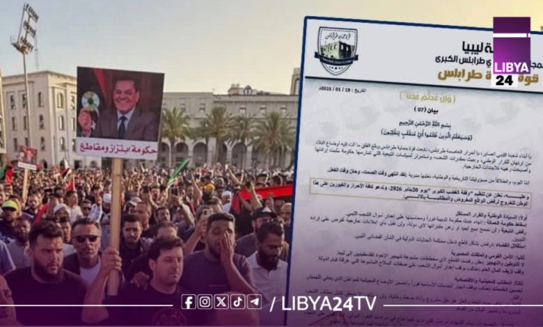 تظمت ما تعرف بـ قوة حماية طرابلس عن تنظيم ما أسمته «وقفة الغضب الكبرى» في خطوة تصعيدية تستهدف إسقاط حكومة عبد الحميد الدبيبة، وسط توترات سياسية وأمنية تشهدها العاصمة طرابلس منذ أسابيع، وتدهور متواصل في الأوضاع المعيشية والخدمية.