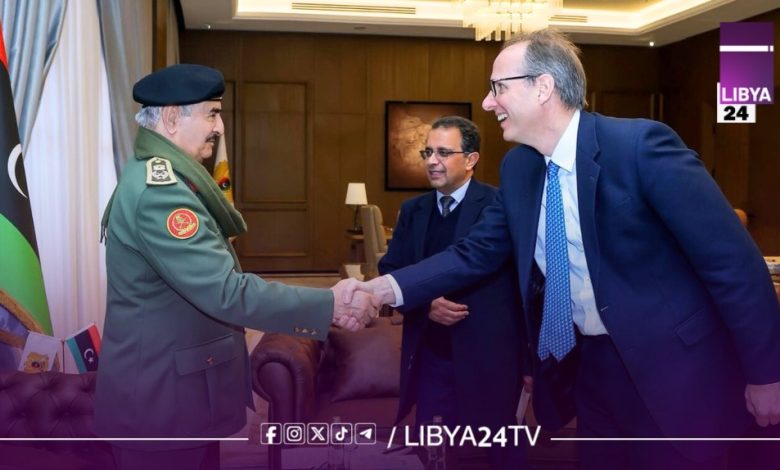 استقبل القائد العام للقوات المسلحة، المشير أركان حرب خليفة أبوالقاسم حفتر، في مكتبه بمقر القيادة العامة، سفير المملكة المتحدة لدى ليبيا، مارتن رينولدز، والوفد المرافق له، في زيارة رسمية تهدف إلى تعزيز أطر التعاون بين البلدين في المجالات الاقتصادية والأمنية.