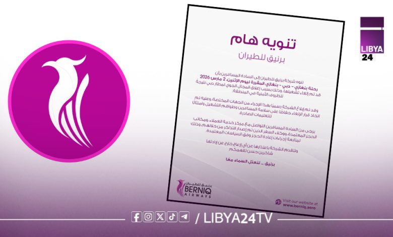 قررت شركة برنيق للطيران، إلغاء تشغيل رحلة بنغازي – دبي – بنغازي المقررة اليوم الاثنين الموافق 2 مارس 2026، وذلك نتيجة إغلاق المجال الجوي لمطار دبي بسبب الأوضاع الأمنية السائدة في المنطقة.