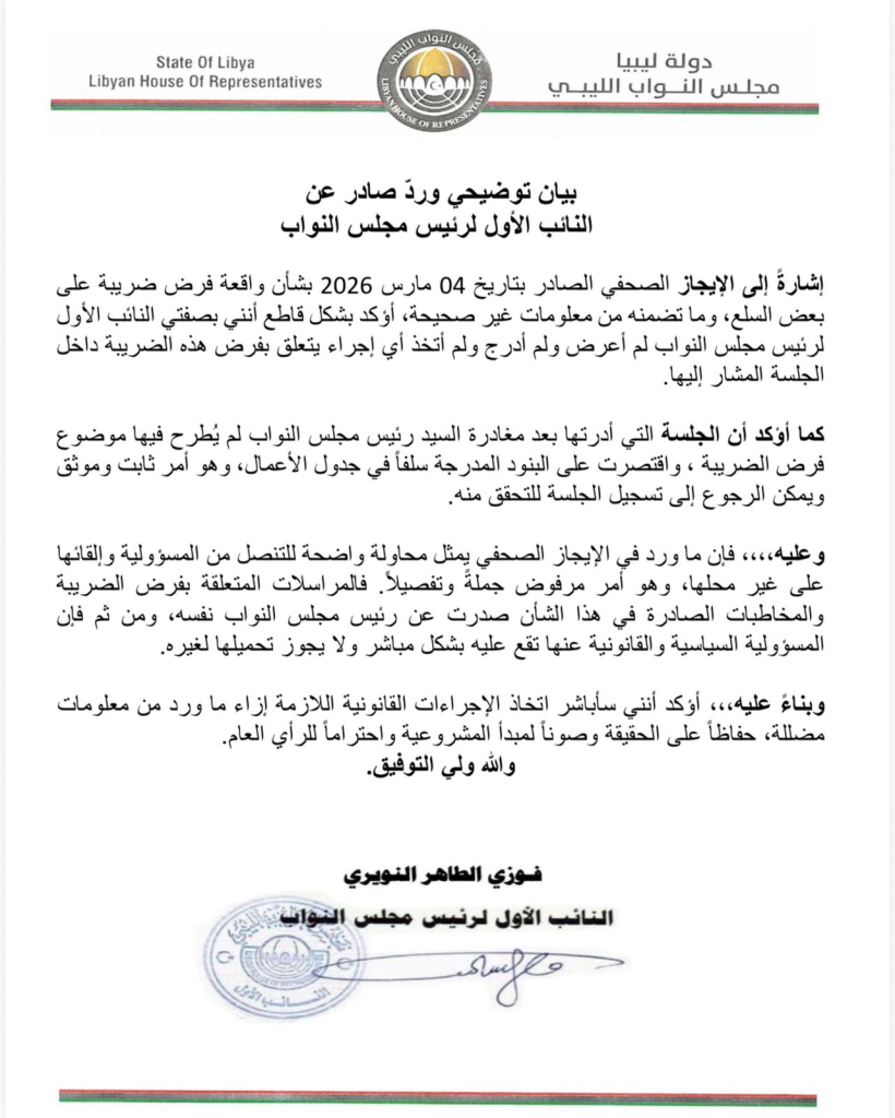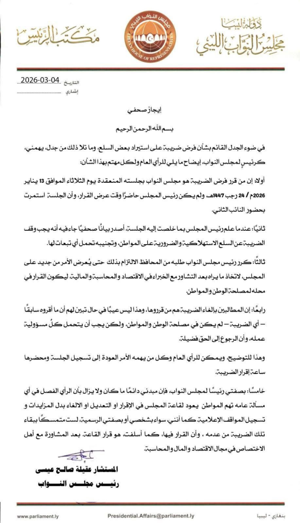وجاء التعديل بعد حالة من الجدل السياسي والإعلامي حول ملابسات تمرير القرار داخل قبة البرلمان، حيث أوضح البيان الجديد أن إقرار الضريبة تم خلال جلسة عُقدت في 13 يناير 2026، بحضور النائب الثاني، في إشارة إلى النائب مصباح دومة وليس النائب الأول كما ورد في البيان الصادر بتاريخ 4 مارس. وأكد صالح أنه لم يكن حاضراً أثناء عرض القرار، وأن الجلسة استمرت برئاسة النائب الثاني.