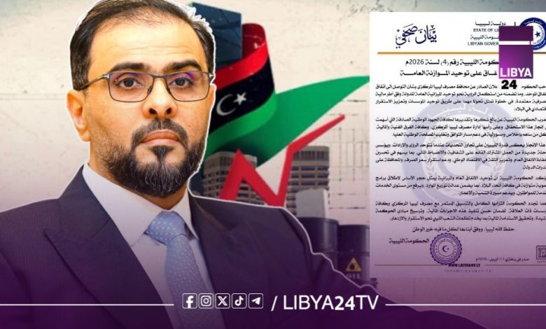 رحبت الحكومة الليبية بالإعلان الصادر عن محافظ مصرف ليبيا المركزي بشأن التوصل إلى اتفاق حول توحيد الإنفاق العام، معتبرةً أن هذه الخطوة تمثل تقدمًا ملموسًا في مسار توحيد الميزانية العامة للدولة ضمن أطر مالية ومصرفية معتمدة.