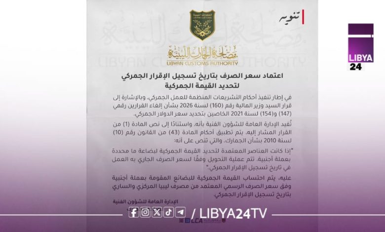 أعلنت مصلحة الجمارك اعتماد سعر الصرف الرسمي المعتمد من مصرف ليبيا المركزي بتاريخ تسجيل الإقرار الجمركي، وذلك لتحديد القيمة الجمركية للبضائع المقومة بالعملات الأجنبية، في إطار تطبيق التشريعات المنظمة للعمل الجمركي.