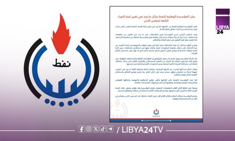 أصدرت المؤسسة الوطنية للنفط بياناً بشأن ما ورد في تقرير لجنة الخبراء التابعة لمجلس الأمن حول ليبيا، وما تضمنه من إشارات تتعلق بقطاع النفط الليبي.