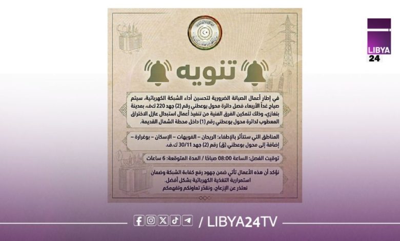 إطفاء مبرمج في بنغازي غدًا لصيانة محول بوعطني وتحسين الشبكة
