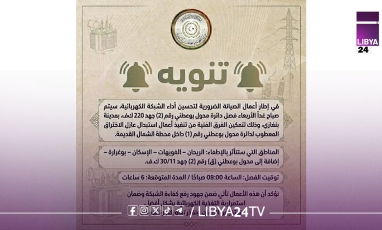 أعلنت وزارة الكهرباء والطاقات المتجددة، عن تنفيذ أعمال صيانة ضرورية تستهدف تحسين أداء الشبكة الكهربائية في مدينة بنغازي، وذلك عبر فصل دائرة محول بوعطني رقم (2) بجهد 220 كيلوفولت صباح يوم الأربعاء. ويأتي هذا الإجراء في إطار خطة فنية تهدف إلى رفع كفاءة المنظومة الكهربائية وتعزيز استقرار التيار في مختلف المناطق.