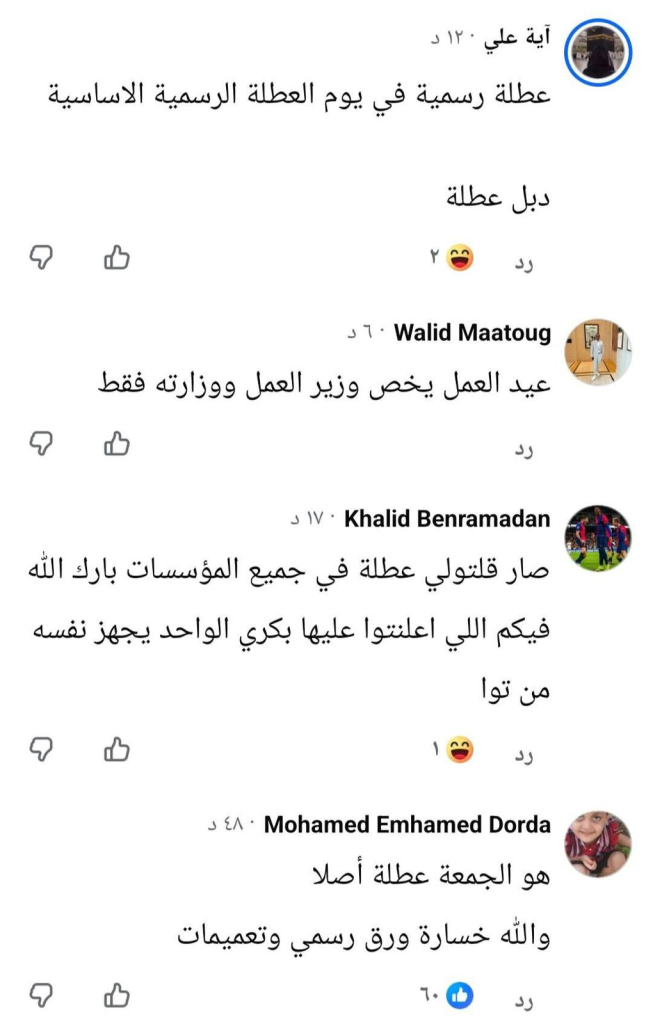 لم تقتصر السخرية على مضمون القرار، بل امتدت إلى تبعاته الافتراضية التي تخيلها المعلقون ببراعة. “عبدو التكا” قاد الموجة الأكثر ضحكاً بتعليقه الأيقوني: “صلاة جمعة نصلوها السبت يعمل بهذا القرار من تاريخ صدوره”، متخيلاً أن القرار الحكومي قد يطال حتى الشعائر الدينية. هذا التعليق حصد عشرات التفاعلات لأنه لامس القلب الحيوي للمفارقة: كيف يمكن ليوم عطلة رسمية أن يكون يوم عطلة عمال وفي نفس الوقت يوم صلاة الجمعة التي لا يمكن ترحيلها إلى السبت؟ المفارقة أصبحت مكتملة الأركان.