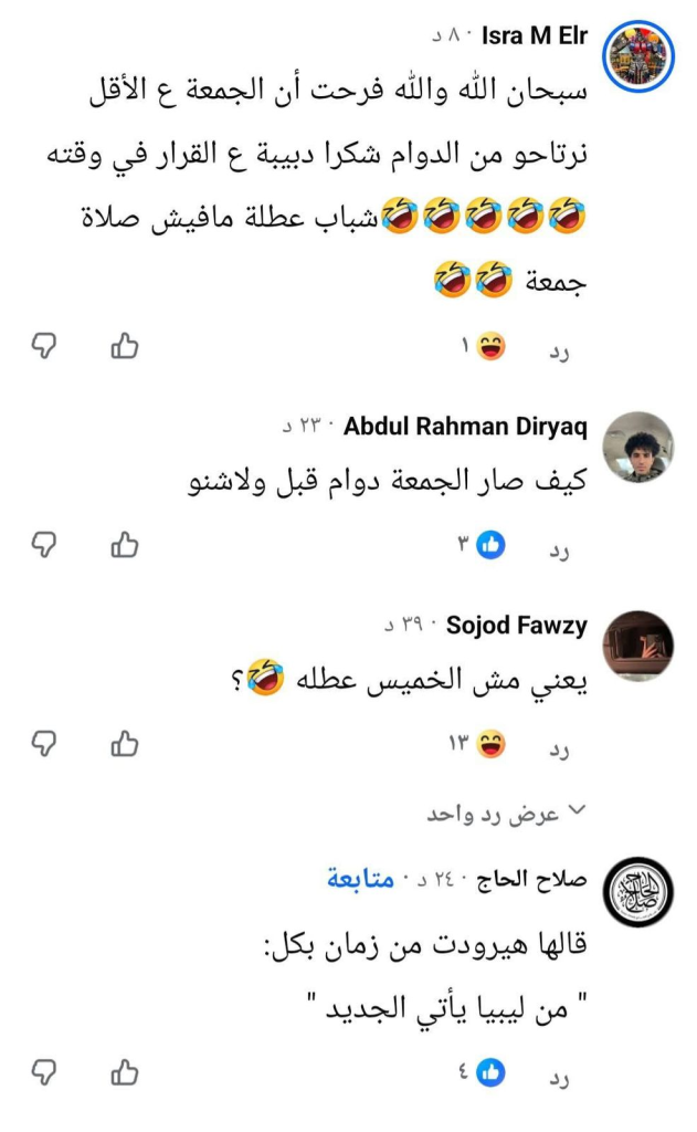 ولم تكن النساء الليبيات أقل حضوراً في الكرنفال الساخر. “Mona Omar” سألت بسخرية أنثوية لاذعة: “يعني عطلة من شنو بضبط، مانديروش بازين ولا مانصلوش في الجامع؟”. البازين، تلك الأكلة الليبية الشعبية التي تُعد عادة يوم الجمعة، أصبحت هنا مقياساً شعبياً للعطلة الحقيقية. أما “Doja Mohammed” فأطلقت السؤال البديهي الذي تبادر إلى ذهن كل ليبي: “من امته الجمعة عطلة؟”، وكأنها تكتشف لأول مرة أن شيئاً بهذا الوضوح يحتاج إلى قرار وزاري. وجاء رد “AS AL” ليكمل السيمفونية: “هوا الجمعة كان مش عطلة؟ مو عطلة أصلا!”