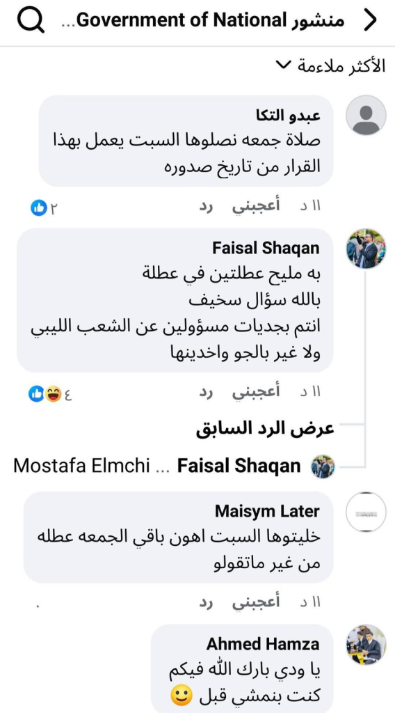 حساب باسم”Faisal Shaqan” صاغ السؤال الجوهري ببلاغة الرجل البسيط الذي أربكه المنطق الحكومي: “به مليح عطلتين في عطلة، بالله سؤال سخيف، انتم بجديات مسؤولين عن الشعب الليبي ولا غير بالجو واخدينها؟”. هذا التساؤل لم يكن مجرد تعليق عابر، بل كان تجسيداً لمعاناة الليبيين مع طبقة سياسية يُنظر إليها غالباً على أنها تمارس لعبة الحكم دون اكتراث حقيقي بمعاناة المحكومين. وتابعت “Maisym Later” بدهشة: “خليتواها السبت اهون، باقي الجمعة عطلة من غير ما تقولو!”، في إشارة إلى أن السبت كان سيكون خياراً أكثر منطقية لو كان الهدف فعلاً منح الناس يوم راحة إضافي.