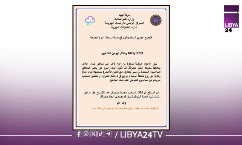 أكمل القراءة »ليبيا 24: توقع المركز الوطني للأرصاد الجوية بأن تظل الأجواء في شمال البلاد خريفية ممطرة من حين لآخر خلال اليومين…
