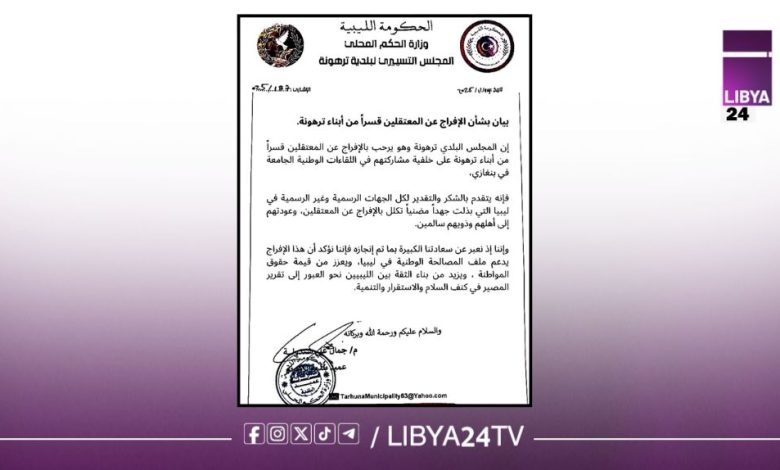 أكمل القراءة »ترهونة ترحّب بإفراج أبنائها وتعدّه دعماً لمسار المصالحة الوطنية أعرب المجلس التسييري لبلدية ترهونة عن ترحيبه الواسع بالإفراج عن مجموعة…