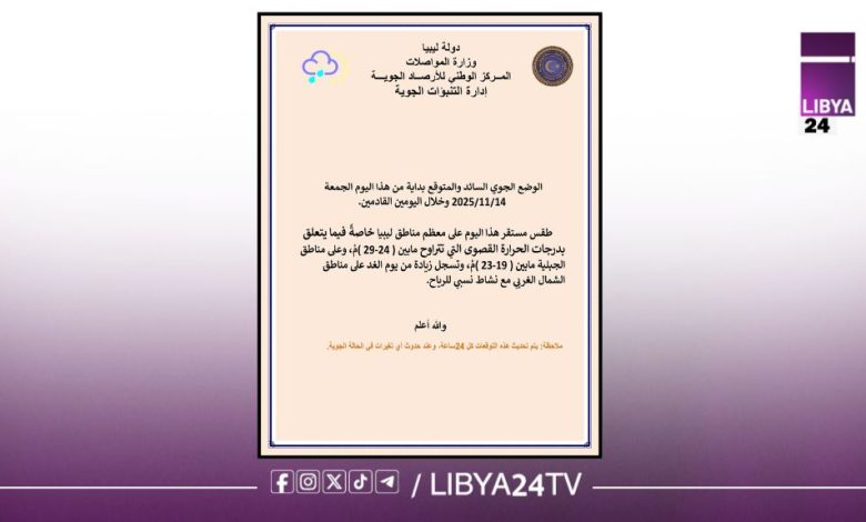 ليبيا 24: أعلن المركز الوطني للأرصاد الجوية أن حالة الطقس في ليبيا تشهد استقرارًا عامًا بداية من اليوم الجمعة 14…