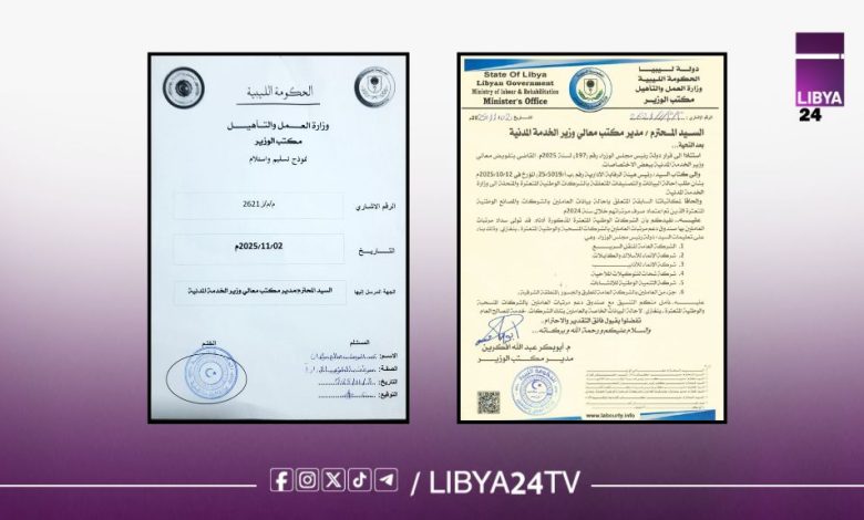 سلمت وزارة العمل والتأهيل،بالحكومة الليبية وزارة الخدمة المدنية الكشف رقم (4) والمتضمن أسماء الشركات الوطنية المتعثرة، التي سددت مرتبات العاملين…