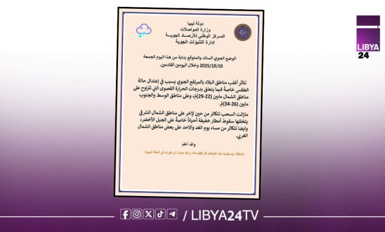 أكمل القراءة »ليبيا 24: يتوقع المركز الوطني للأرصاد الجوية، أن تتأثر أغلب مناطق البلاد بالمرتفع الجوي بداية من اليوم الجمعة وخلال اليومين…
