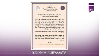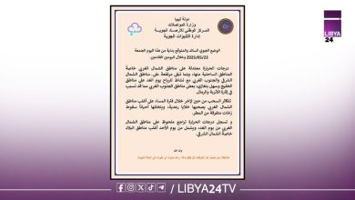 ليبيا 24 أعلن المركز الوطني للأرصاد الجوية، عن الأحوال الجوية المتوقعة على ليبيا خلال الأيام الثلاثة القادمة ابتداء من اليوم…