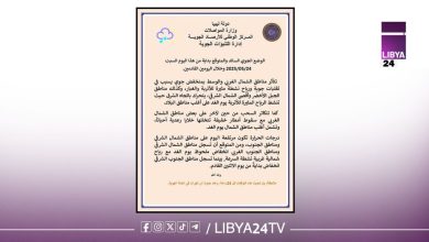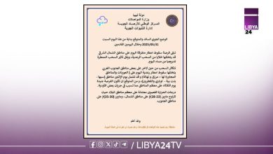 ليبيا 24 توقع المركز الوطني للأرصاد الجوية، الأحوال الجوية في ليبيا خلال الأيام الثلاثة القادمة ابتداء من اليوم الخميس 29…