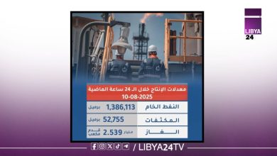 ليبيا 24: أعلنت المؤسسة الوطنية للنفط أن إنتاج البلاد خلال الـ 24 ساعة الماضية بلغ 1,386,113 برميلًا من النفط الخام،…