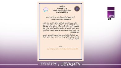 ليبيا 24 أعلن المركز الوطني للأرصاد الجوية، عن الأحوال الجوية المتوقعة على ليبيا خلال الأيام الثلاثة القادمة ابتداء من اليوم…