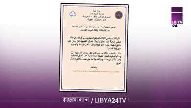ليبيا 24: يتوقع المركز الوطني للأرصاد الجوية، أن تتأثر أغلب مناطق البلاد بالمرتفع الجوي بداية من اليوم الجمعة وخلال اليومين…